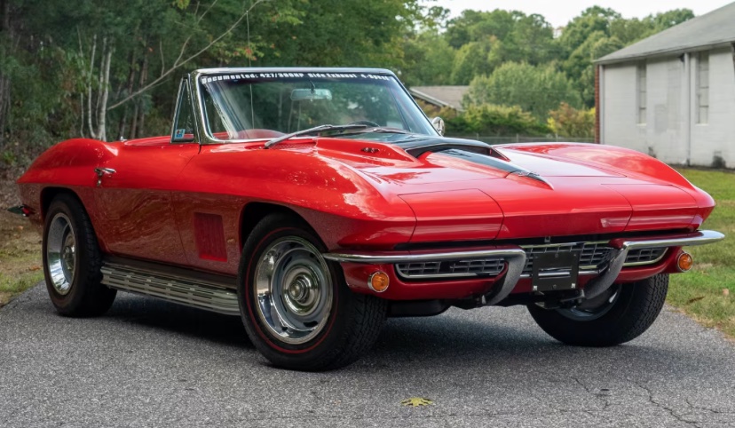 1001W..1967 Corvette Triple Crown Convertible, 427-390 hp, factory air, 4 speed, numbers matching motor, transmission and rear end. Rally Red paint with Black stinger, Red interior and White soft top. Super rare color combination. Body-off restored by Nabers Corvette Restoration of Houston, Tx. in show condition. NCRS Regional Top Flight award, Bloomington Gold certified, and Triple Crown award at the November 2006 Vette Fest National. These type restorations normally cost between $150,000.00 to $200,000.00. The best of the best gets even better with the option list of: factory air, factory side exhaust (born with), power steering, M-21, 3.55 posi, SS brakes, AM/FM radio, tinted glass, rallys, and red stripe tires. Most all factory correct type components including the spare, jack, jack tools, shocks, seat belts, washer system, shifter, shielding, braided wires, air cleaner, alternator, distributor, carb, hoses, hose clamps, window glass, valve covers, starter, radiator, gas door assembly, glove box door, warranty book, owners manual, sales brochure, and T-3 headlights. Documented with the tank sticker/build sheet, owners manual packet, warranty book, old registrations, owner history, title copies, NCRS/Bloomington certificates, Triple Crown award and judging sheets. Looks, runs, and drives excellent. CC:1 $229,000.00