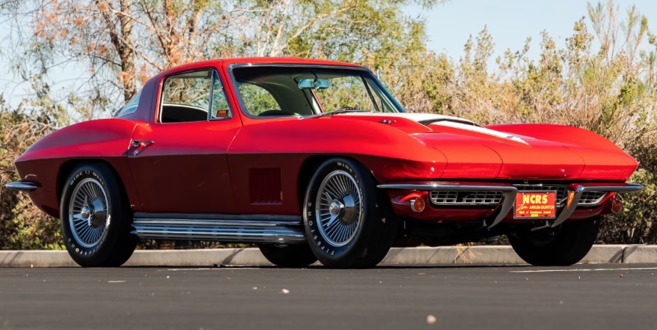 1003W..1967 Corvette Duntov Coupe, 427-435 hp, 4 speed with numbers matching motor, transmission, rear end and original body/trim tag. Very rare Rally Red paint with White stinger and White/Black combo interior. Body-off restored in show condition. Bloomington Gold, multiple NCRS awards including Duntov Mark of Excellence and Triple Crown award. NCRS validated tank sticker. Options: M21, 3.55 posi, transistorized ignition, factory side exhaust, tinted glass, AM/FM radio and aluminum wheels. From the Tom and Alisa Green Collection.