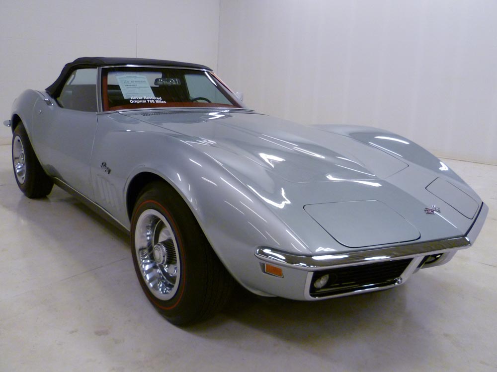 1005W..1969 Corvette Time Capsule Convertible, 350-350 hp, 4-speed, numbers matching motor, transmission and rear end, 802 actual miles. Cortez Silver paint with Red interior and Black soft top. Original unrestored super low-mile time capsule with excellent cosmetics including chassis and engine compartment. NCRS Top Flight award in 2015. These original unmolested cars are among the rarest of rare and are rising to the top of the Corvette food chain as unrestored cars are used as guideposts for restorers, shining a light on the way vehicles were originally built. Super rare color combination! Super low miles!! Optioned with headrests, M-21, 3.70 posi, SS brakes, A.I.R., AM/FM radio, tinted glass, rallys, and red stripe tires. Most all factory correct type components including the spare, jack, jack tools, clear floor mats, shocks, seat belts, washer system, smog system, shifter, shielding, air cleaner, alternator, distributor, spark plug shields, hoses, hose clamps, window glass, valve covers, ball joints, original exhaust, frame stencil, owners manual, sales brochure, and T-3 headlights. Documented with the NCRS Top Flight certificate, judging sheets, owner/mileage history, owners manual, sales brochure and 3-ring binder. Looks, runs, and drives excellent. CC:1/+2 $129,000.00