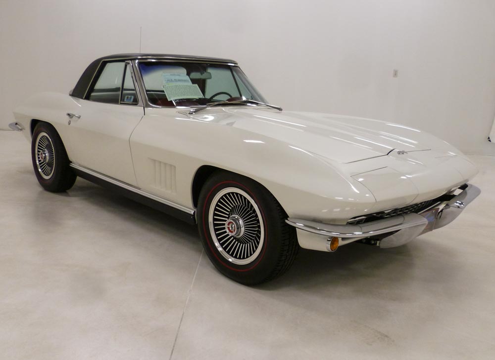 1007W..1967 Corvette Convertible with Two-Tops, 427-435 hp, 4 speed, numbers matching motor, transmission, rear end and original body/trim tag. One-owner car with only 13,998 actual miles. Goodwood Green paint with White stinger, Saddle Tan interior, White soft top and Black Vinyl Hardtop. Bloomington Gold, Survivor and Benchmark certified in 2016. Also in Bloomington Gold Special Collection in 2017. Options: M21, 3.70 posi, power brakes, J56 special heavy duty brakes (1 of 267 produced in 1967), off road exhaust, AM/FM radio, Firestone Super Sport redline tires and five Kelsey Hayes bolt-on wheels (1 of 720 produced in 1967). From the Bachman Ferrari Collection who bought this car new in 1967.