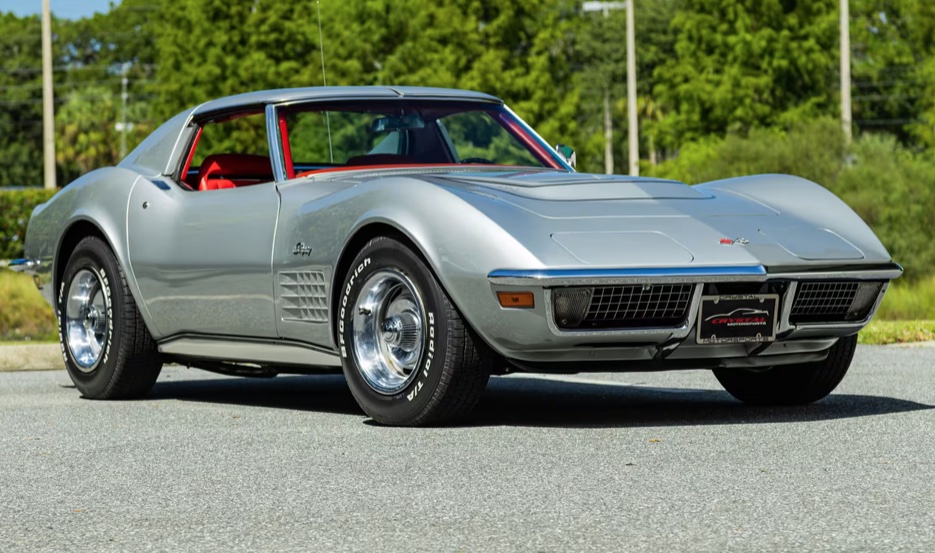 1002W..1970 Corvette Coupe with removable T-Tops, LT1, 350-370 hp, 4 speed, numbers matching original motor, transmission and rear end. Ultra rare and desirable color combination of Cortez Silver paint with a Monza Red interior. Body-on restored in excellent condition. Options: M21, 3.70 posi, AM/FM stereo radio, rallys wheels and raised white lettered tires. Has tank sticker and NCRS Shipping Data report.