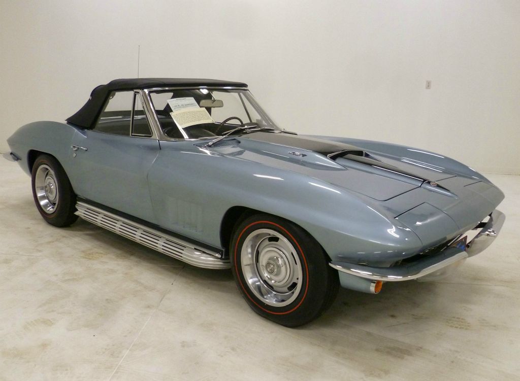 1027U..1967 Corvette Convertible, two tops, 327-300 hp, factory air, powerglide, numbers matching original motor, transmission and rear end with CCAS/Grenning Engine Stamp Affirmation, also has factory original body/trim tag, 73,121 actual miles.