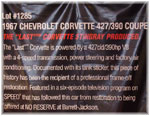 The "Last" Sting Ray rolled across the block bringing a much deserved bid for a car with such a historic and weighty pedigree of $600,000.00. The "Last" Corvette Project was more than a simple restoration as it out performed every expectation. Classic car enthusiasts came together to make this '67 an award winner and The Chip Miller Charitable Foundation benefited from matching funds with a gift of $40,000.00. The pair of 1963 Corvette Tankers, The pair of 1963 Tankers, "The Buckeye Bookends", sold for a hefty $561,000.00 including the juice. The Tankers were perfectly matched as one was built for bare-bone speed and the other for road hugging comfort. Any questions? email: proteam@proteamcorvette.com